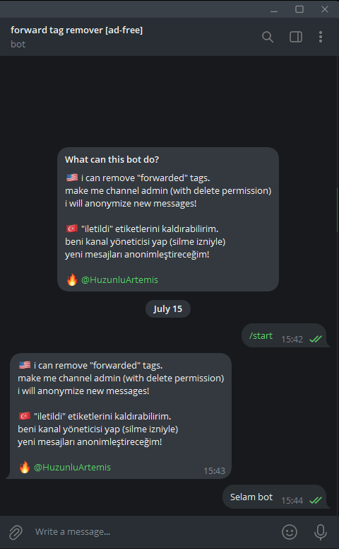 🇹🇷 Türkçe: CleanForwardBot: Telegram Mesajlarını Anonimleştir ve Temizle (İletildi Etiketi Kaldırıcı Bot)