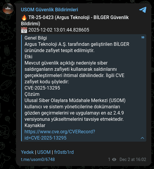 Şekil 1: Otomasyon sistemi tarafından Telegram kanalına iletilen anlık USOM bildirimi.