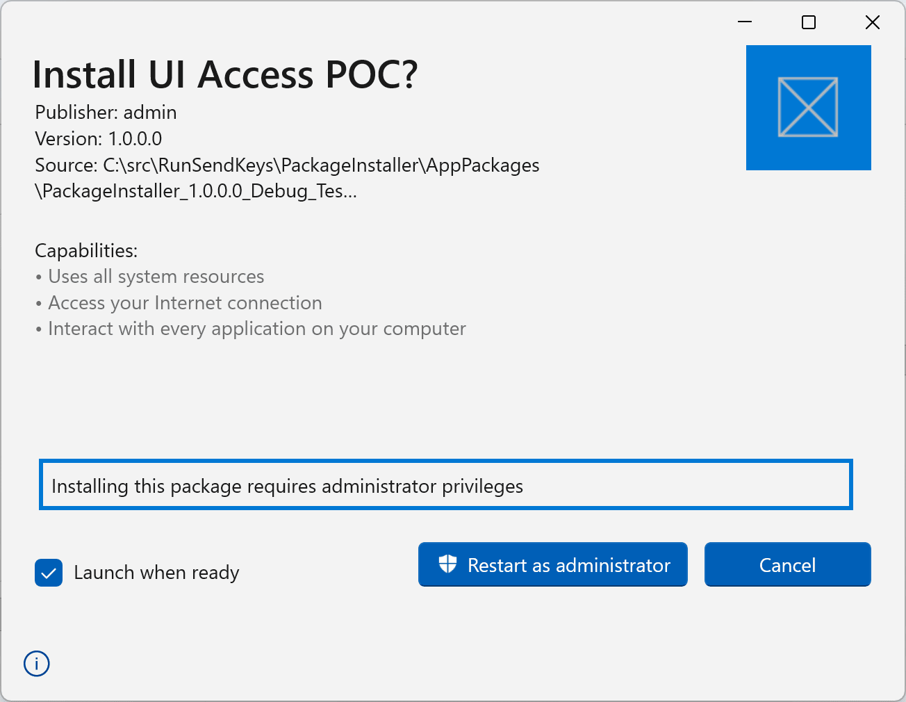 İlginç bir şekilde, MSIX’i oluştururken manifest’e ekleyebileceğiniz ve paketlenmiş yürütülebilir dosyayı Yüksek bütünlüklü UI Access’e yükseltecek bir uiAccess kısıtlı yeteneği (restricted capability) vardır. Ancak bunu yaptığınızda, paketin yüklenmesi aşağıda gösterildiği gibi yönetici ayrıcalıkları gerektirir ve bu nedenle bir atlatma değildir.